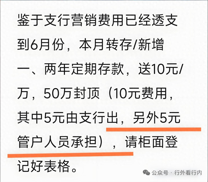 员工辛辛苦苦拉来存款,奖励客户的钱,银行不想全出,最后竟然要基层员工自己掏腰包垫一半。说白了,就是业绩归银行,成本归员工;功劳归领导,风险归基层。这哪里还是上班?这分明就是“付费上班”。一纸通知,撕开了银行业最难堪的一层遮羞布事情并不复杂。根据网传通知,某支行因为营销费用已经透支到6月份,所以本月新增或者转存1到2年期定期存款时,给客户的揽储奖励要由两部分承担:支行出一半,管户员工个人出一半。这句话看着轻飘飘,落到员工头上,却是实打实的压力。按“10元/万”的奖励算,员工如果拉来50万存款,就得自己掏250元;拉来100万,就得倒贴500元。要是任务再重一点,一个月几百上千地往外贴,并不夸张。最荒唐的地方就在这儿:员工明明是在给银行干活,结果却要自己承担营销成本。这笔账,怎么想都不对。银行口口声声强调“高质量发展”“价值创造”,可到了基层这里,价值创造变成了个人买单,经营压力变成了员工兜底。表面上看,这是营销费用不够;实际上,是把本该由机构承担的经营成本,偷偷转嫁给了最没有话语权的人。银行人为什么明知不合理,还得咬牙往里贴?很多外行看到这种事,第一反应都是:不合理就别干啊,为什么非要自己贴钱?问题就在于,很多基层员工根本没有选择。在不少银行网点,存款任务不是“参考指标”,而是直接和绩效、评优、晋升甚至日常生存挂钩的硬杠杠。完不成任务,轻则通报批评,重则绩效打折,甚至全扣。对于一些本来工资就不高的基层员工来说,一旦考核被罚,最后到手收入可能连当地最低工资线都守不住。所以很多人并不是心甘情愿贴钱,而是在两害相权取其轻。是贴几百块保住工资,还是一分钱不贴然后被扣得更惨?在这种考核逻辑面前,所谓“自愿”,往往只是被逼出来的妥协。尤其是柜员、后台、行政这些本来就不直接做营销的岗位,也被一股脑儿卷进来。客户不在他们手里,资源不在他们手里,话语权也不在他们手里,但任务照样压下来,考核照样算到头上。到最后,大家为了保绩效、保面子、保排名,只能自己想办法填坑。这不是激励机制,这是赤裸裸的转嫁和裹挟。“全员营销”走到最后,最先被榨干的永远是基层这些年,银行最擅长的一个词,叫“全员营销”。